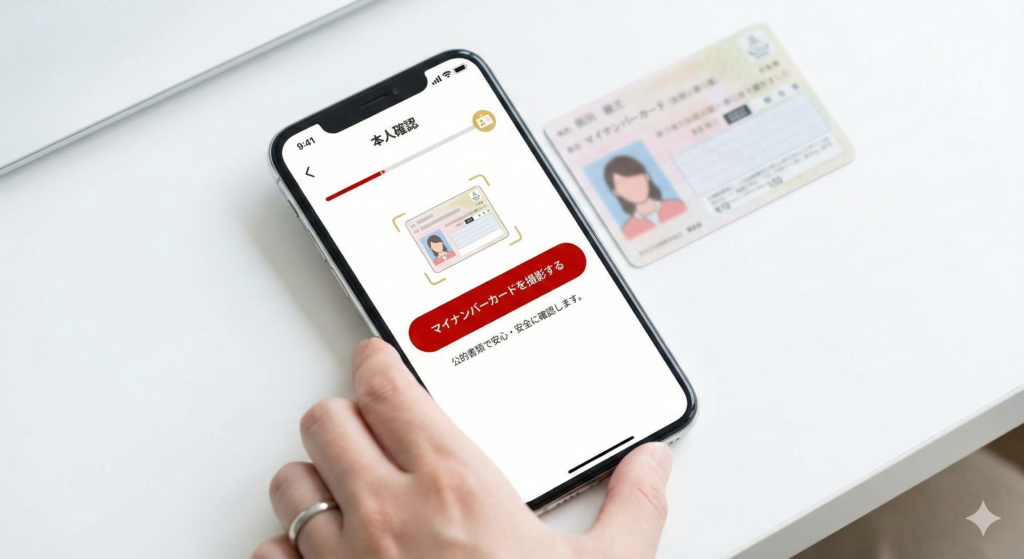 - 「スマホで本人確認」を選択。指示に従って、マイナンバーカードの表面・厚み・裏面をカシャッと撮影します。